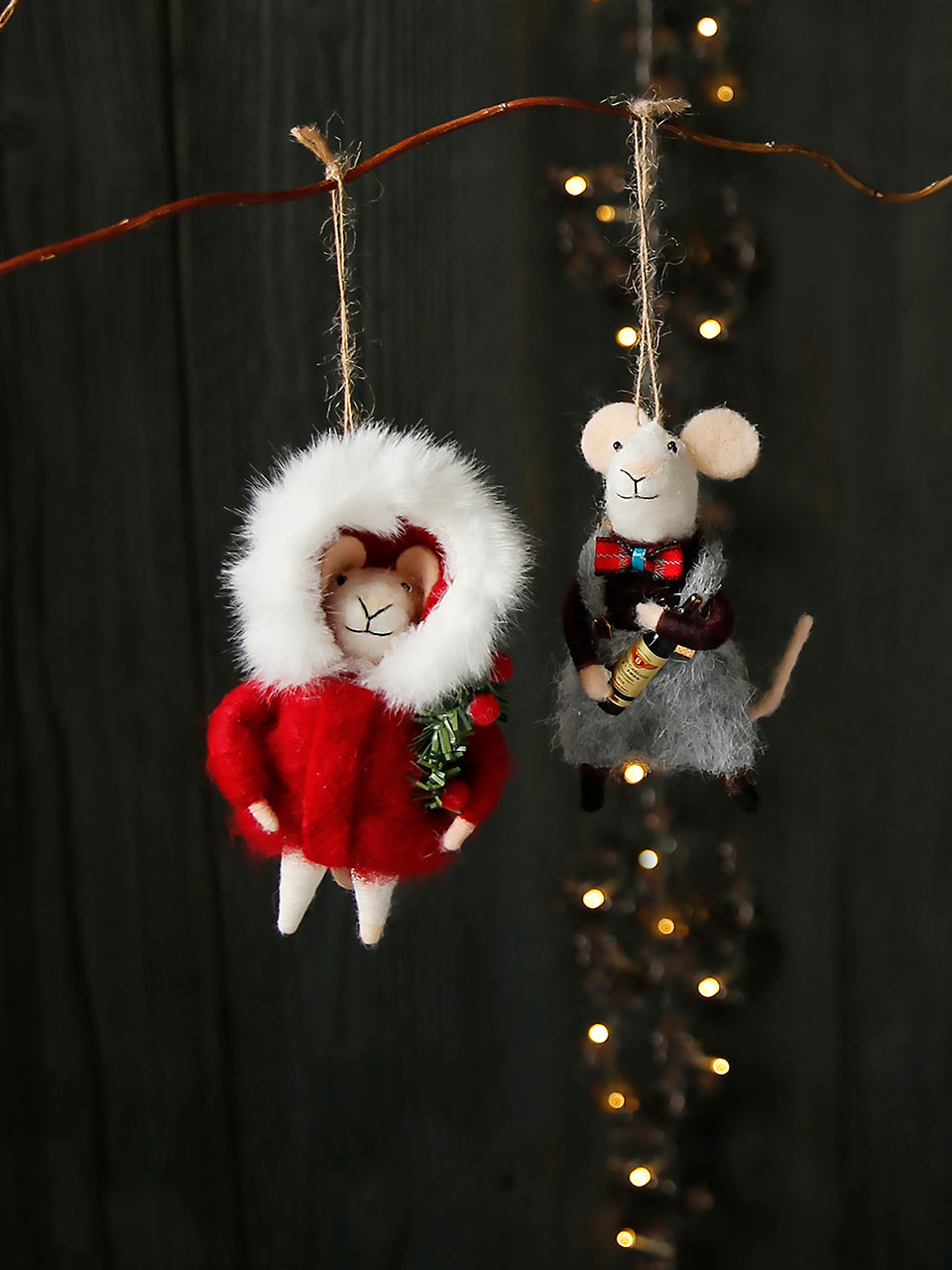 Souris de Noël artisanales, soigneusement emballées et portant des cadeaux tels que du vin, des fleurs ou une couronne. Prêtes à être accrochées au sapin et à faire le bonheur de tous à chaque période des fêtes.