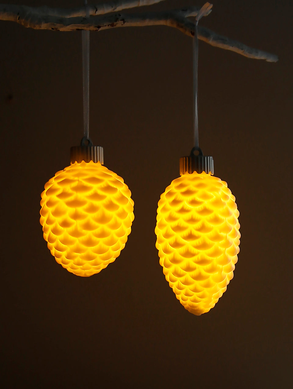 Boules lumineuses en céramique blanche en forme de pomme de pin, ornées d'un motif détaillé. À la nuit tombée, le motif lumineux crée une décoration de sapin spectaculaire.