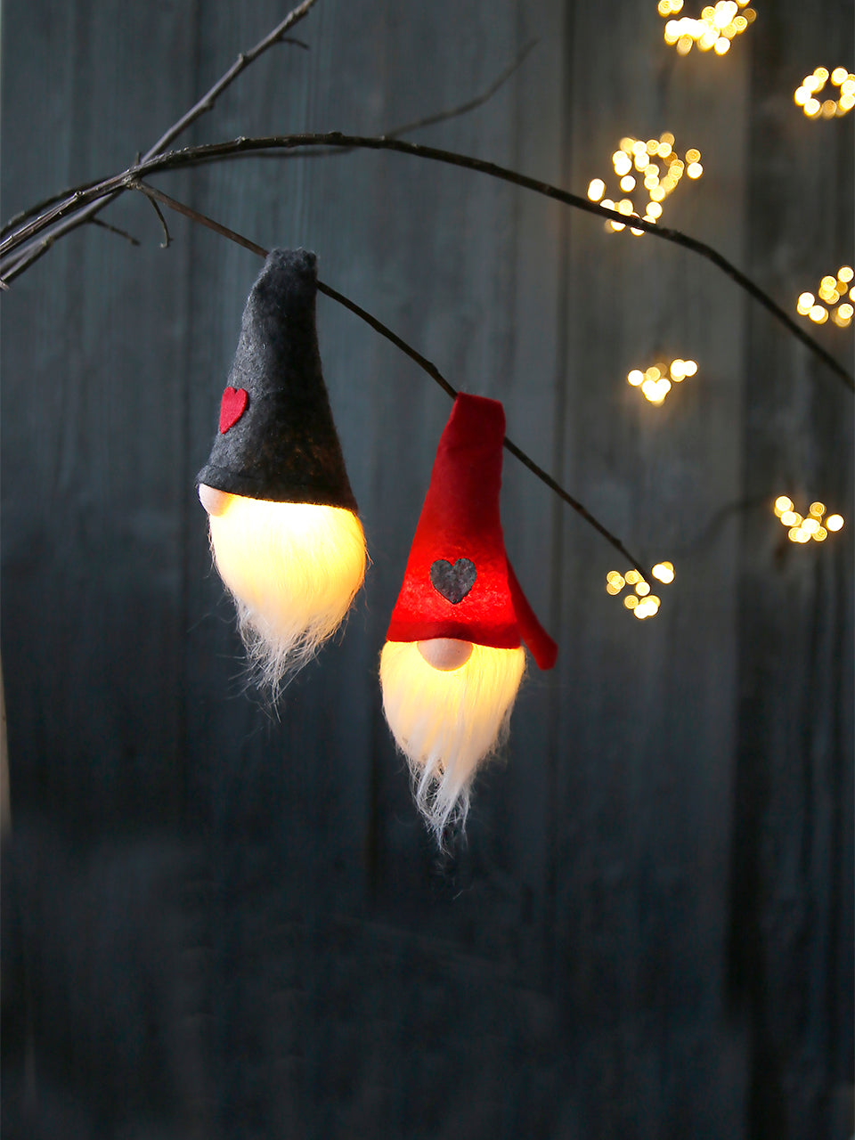 Comme si ces joyeux lurons n'étaient pas déjà assez gais au crépuscule, ils diffusent une douce lumière. Grâce à leur petit chapeau orné d'un cœur, ils peuvent être suspendus partout.