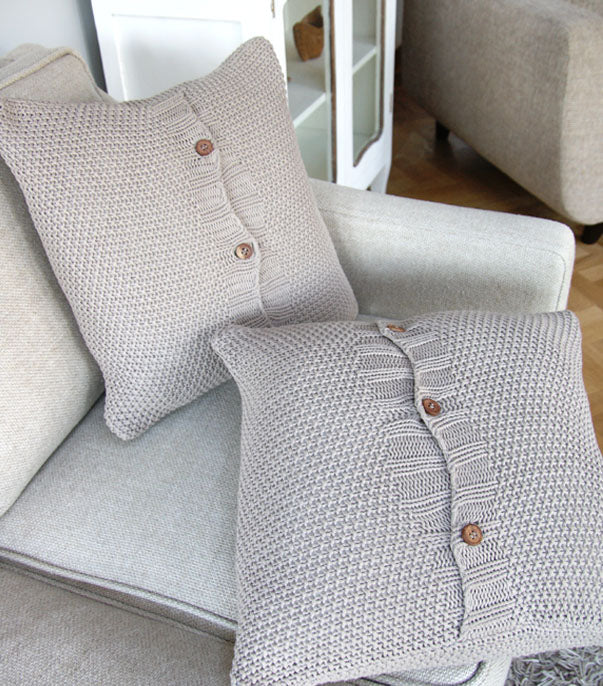 Coussin tricoté incroyablement doux et confortable en coton, avec un point lâche appelé « point mousse » et de jolis boutons en bois. Sa couleur pierre s'harmonise avec tous les canapés et, étant en coton, il passe en machine (lavage délicat recommandé). Garniture incluse.