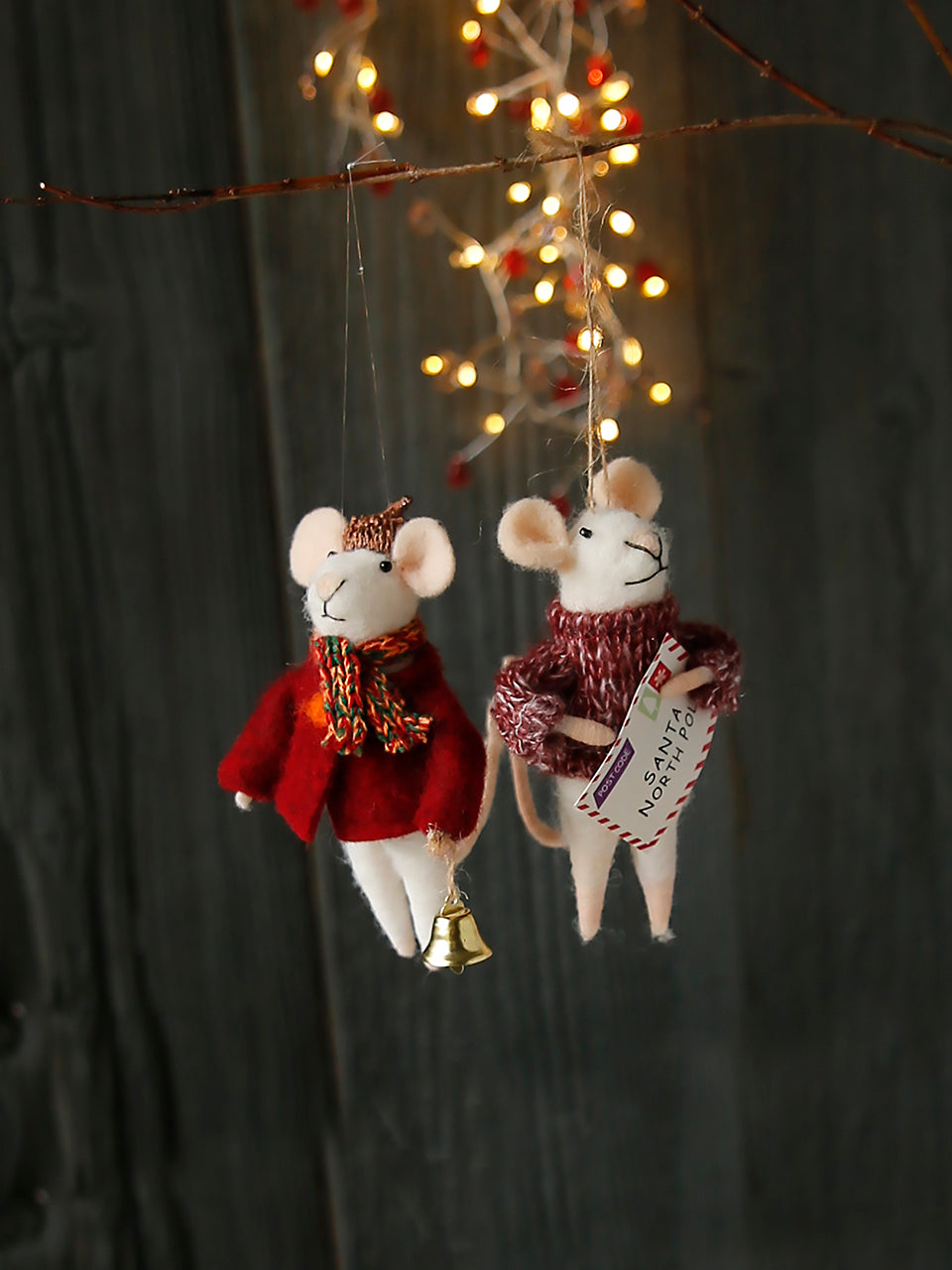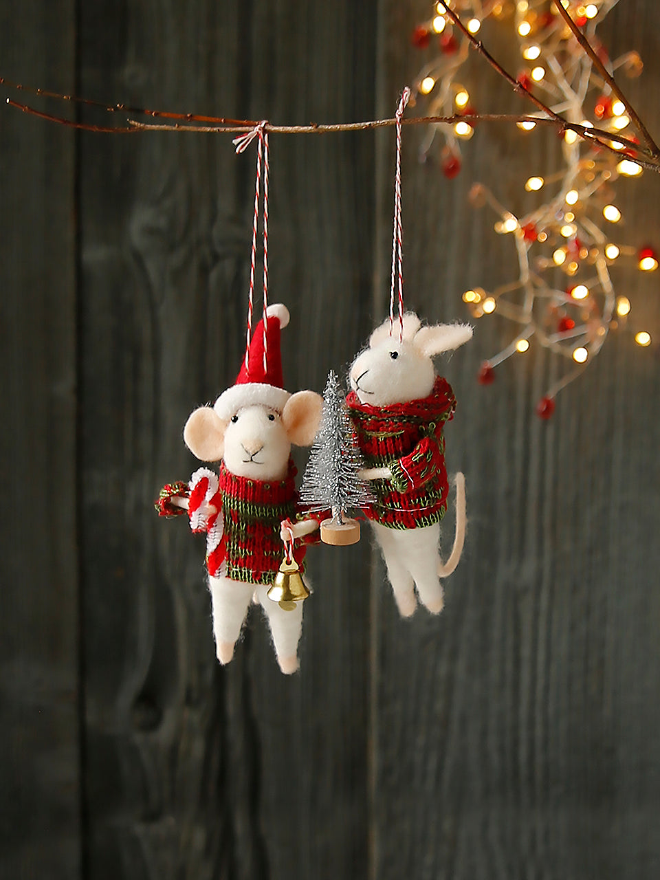 Souris de Noël artisanales, soigneusement emballées et portant des cadeaux tels que des cannes de Noël, des sapins ou un petit mot pour le Père Noël. Prêtes à être accrochées au sapin et à faire le bonheur de tous pendant les fêtes.